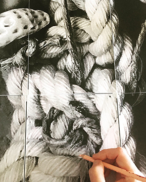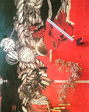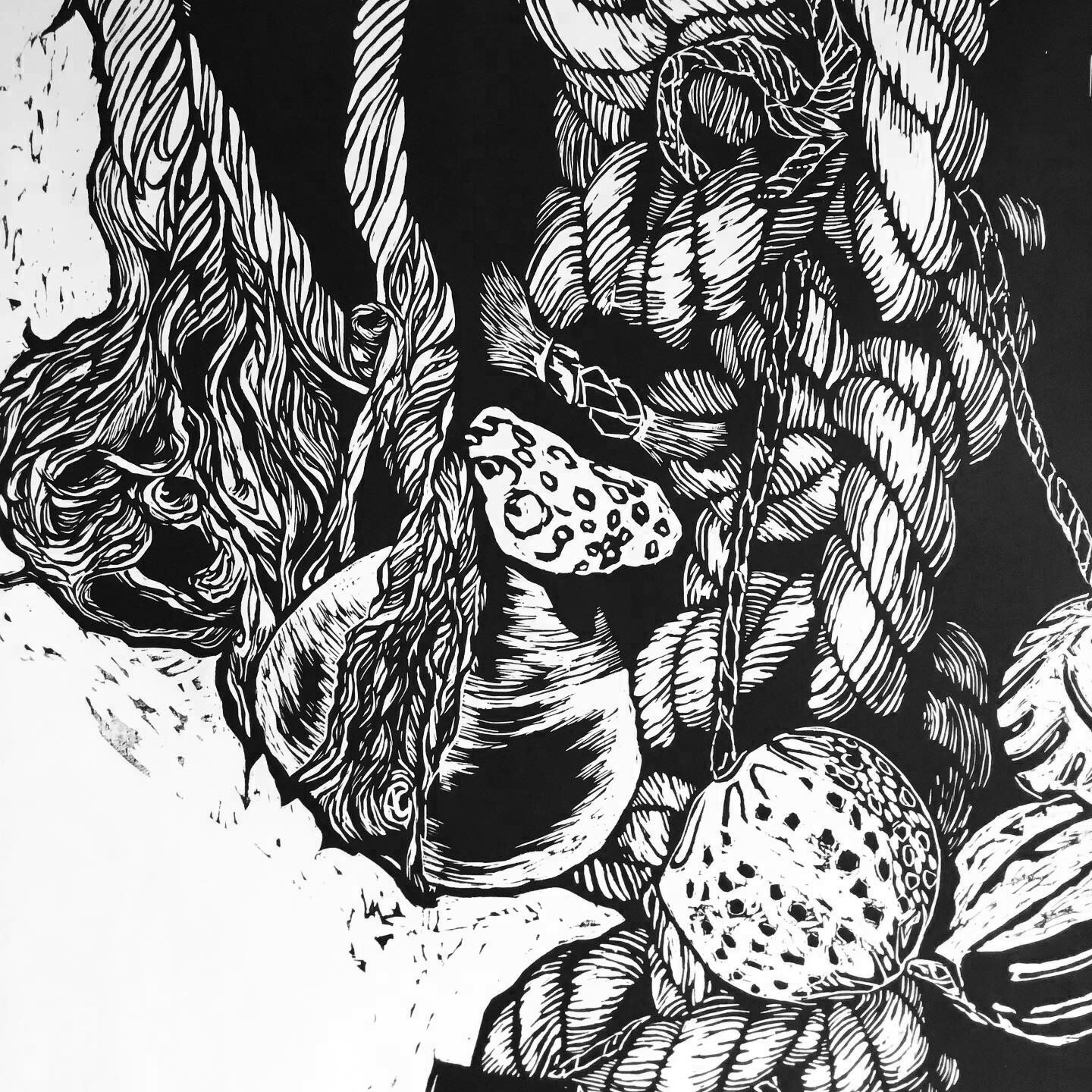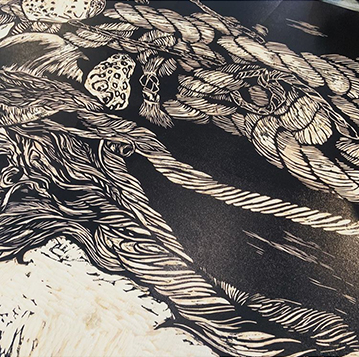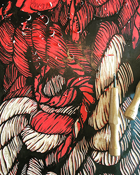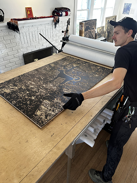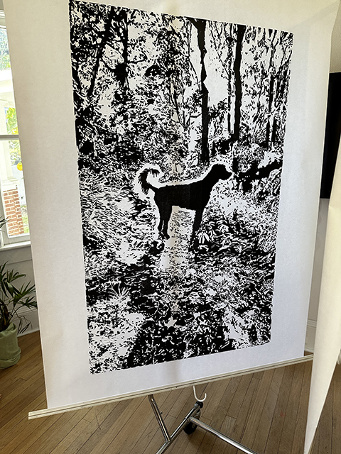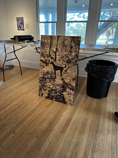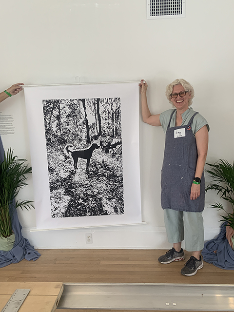 We loved being a part of this large wood cut print community two times. The first event was hosted at the Morean Center in downtown Saint Petersburg where we printed a 3’ x 6’ large scaled “sea knot” graphic. The piece reflected a 2D version one of our woven wall sculptures. Recently we traveled to New Smyrna Beach to participate in the workshop at the Atlantic Center of the Arts. This time we had carved a 3’ x 4’ image of our pup, Roscoe, surrounded by nature, woods and trees.