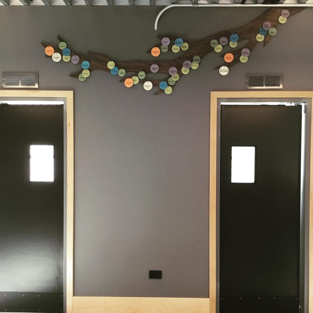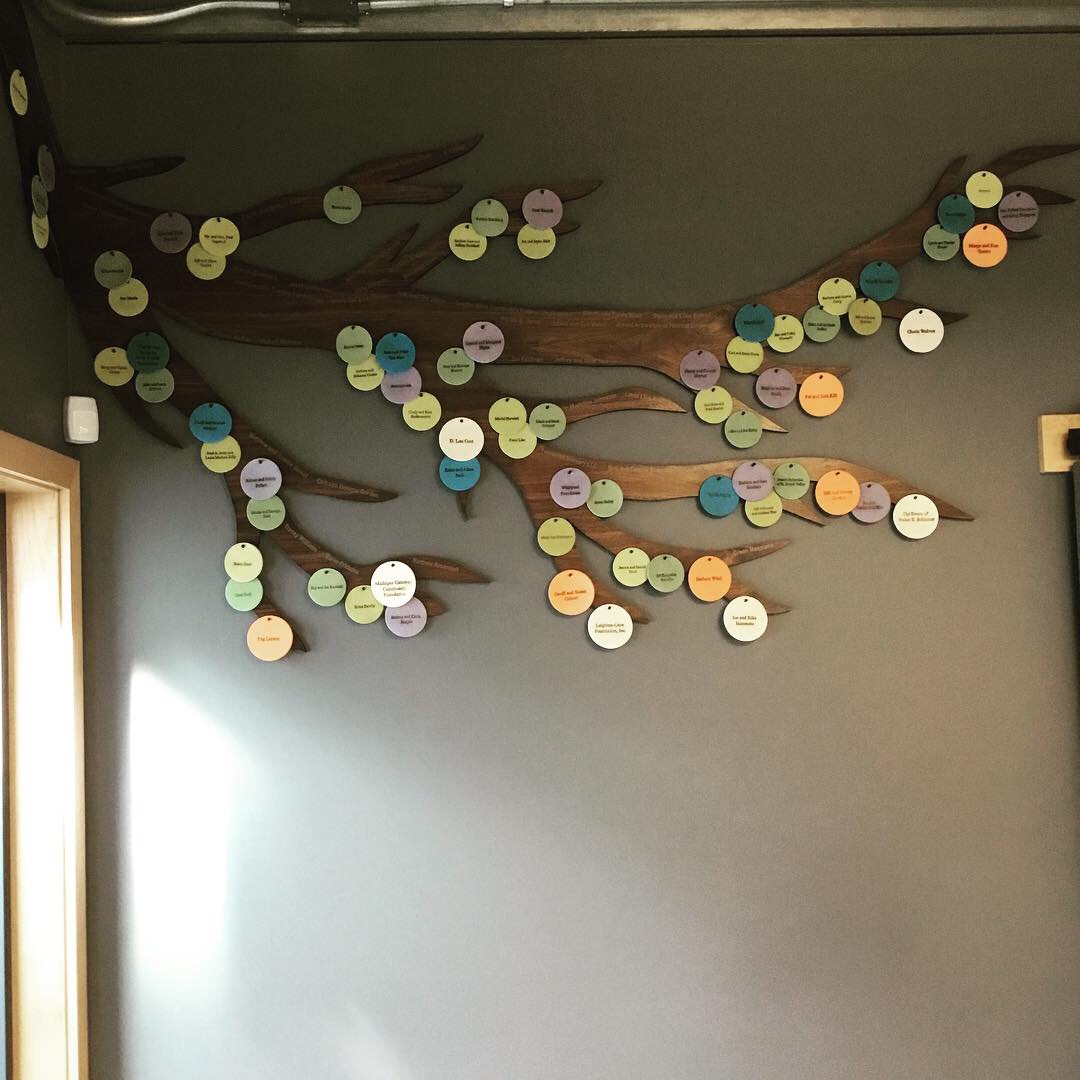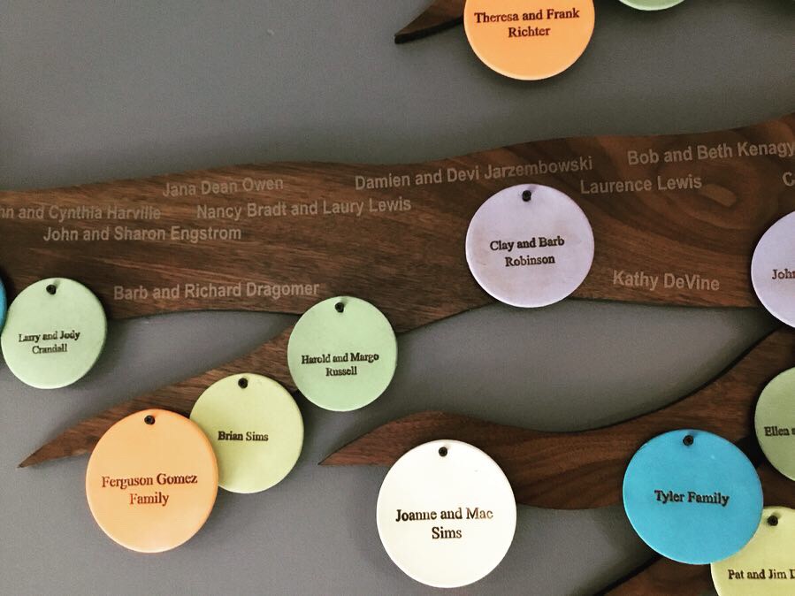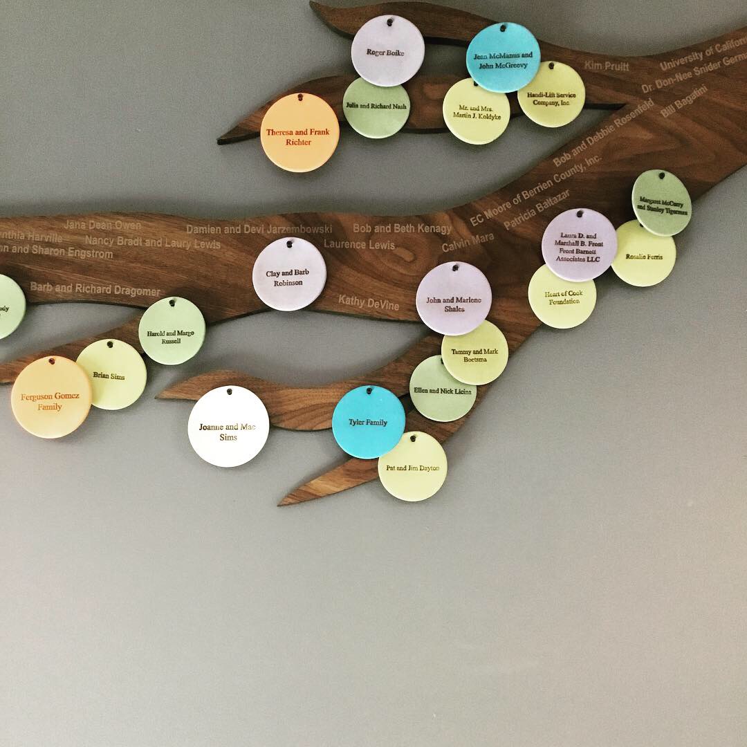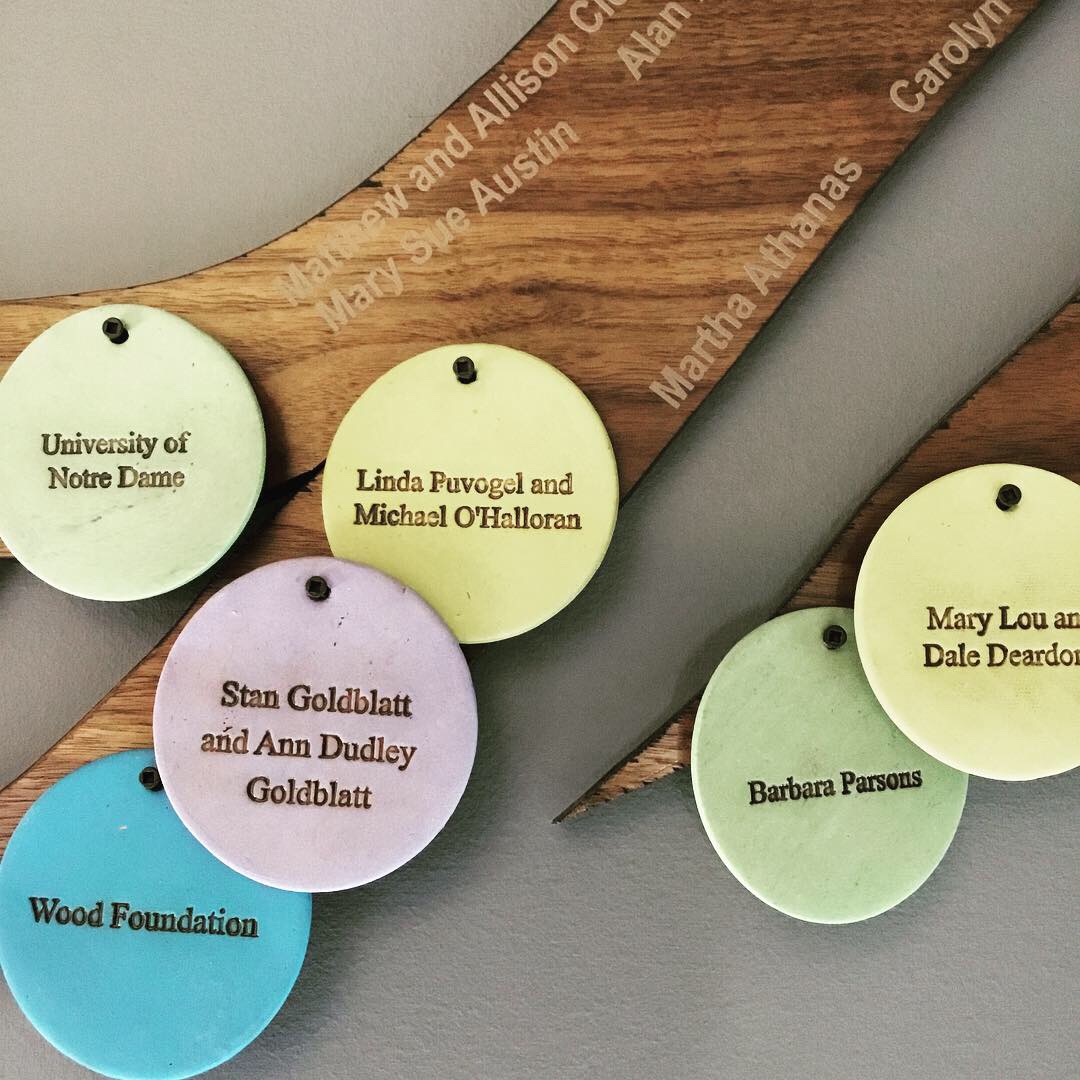 This unique donor wall install was designed and handmade for the Sims Educations Center at Fernwood Botanical Gardens in Niles, Michigan. The building was designed by the reputable architect, Stanley Tigerman, and we wanted our installation to reflect the grounds and building as well. We incorporated imprinted hand stained porcelain charms and large sculptured walnut branches to showcase the donors that made the project possible.