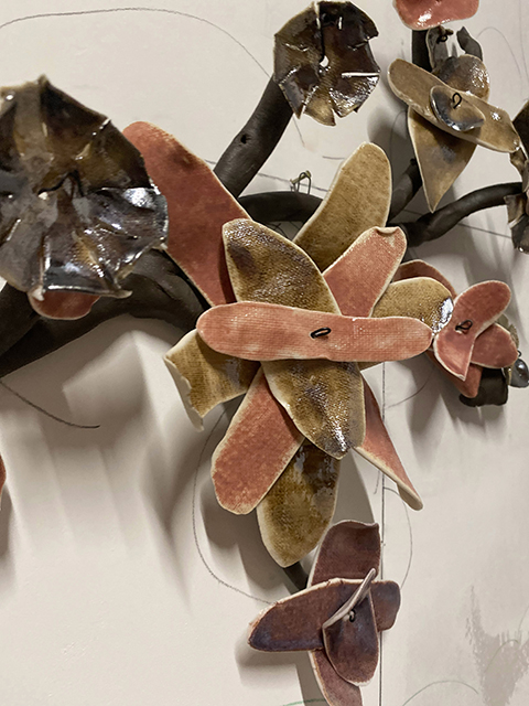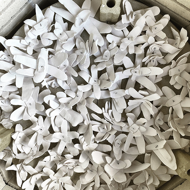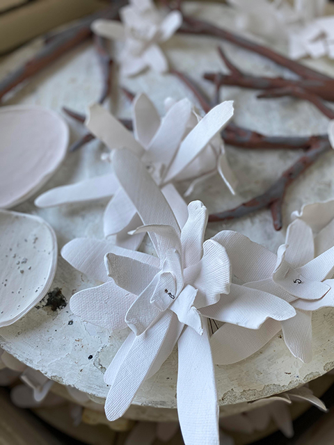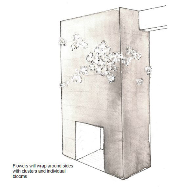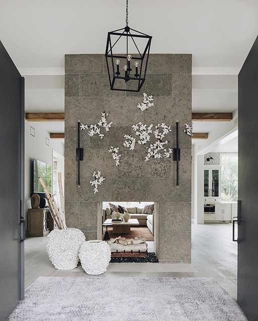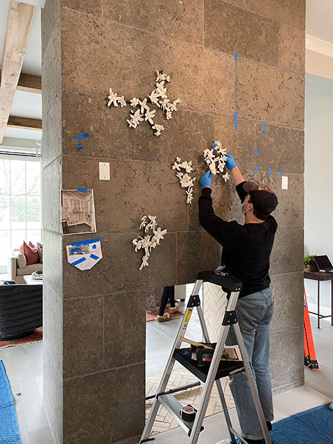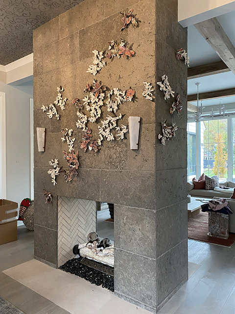 This commission of hand crafted porcelain flowers was the perfect compliment to the stone fireplace the pieces were applied to. Our friends at Jorje Design have a knack for incorporating custom art pieces into their interiors. We also crafted individual plaster textured discs in this clients bar ceiling.